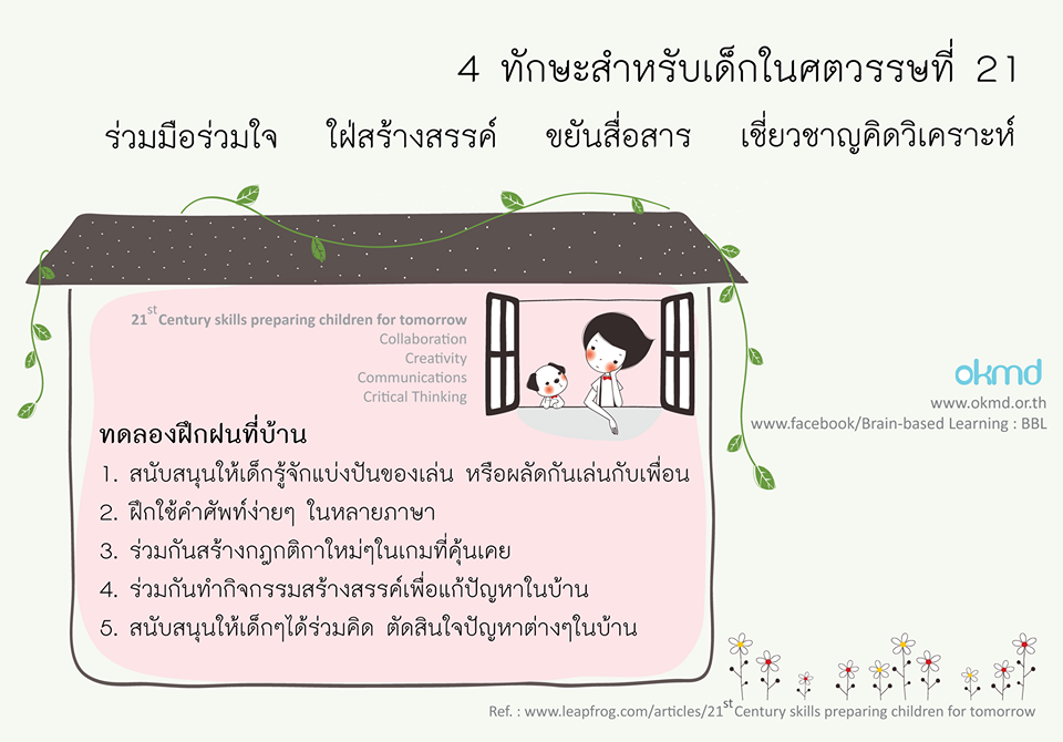 ทักษะในศตวรรษที่ 21 กลายเป็นประเด็นร้อนในแวดวงการศึกษา ที่จะต้องเริ่มเตรียมผู้เรียนให้เข้าถึงทักษะเหล่านี้ได้อย่างมีประสิทธิภาพ ในฐานะพ่อแม่ เราจะมีส่วนร่วมในการเตรียมลูกให้พร้อมรับมือต่อกระแสความเปลี่ยนแปลงเหล่านี้ได้ เริ่มต้นง่ายๆ ที่บ้าน ก่อนที่โรงเรียนอนุบาลจะเป็นคำตอบที่สายเกินไป